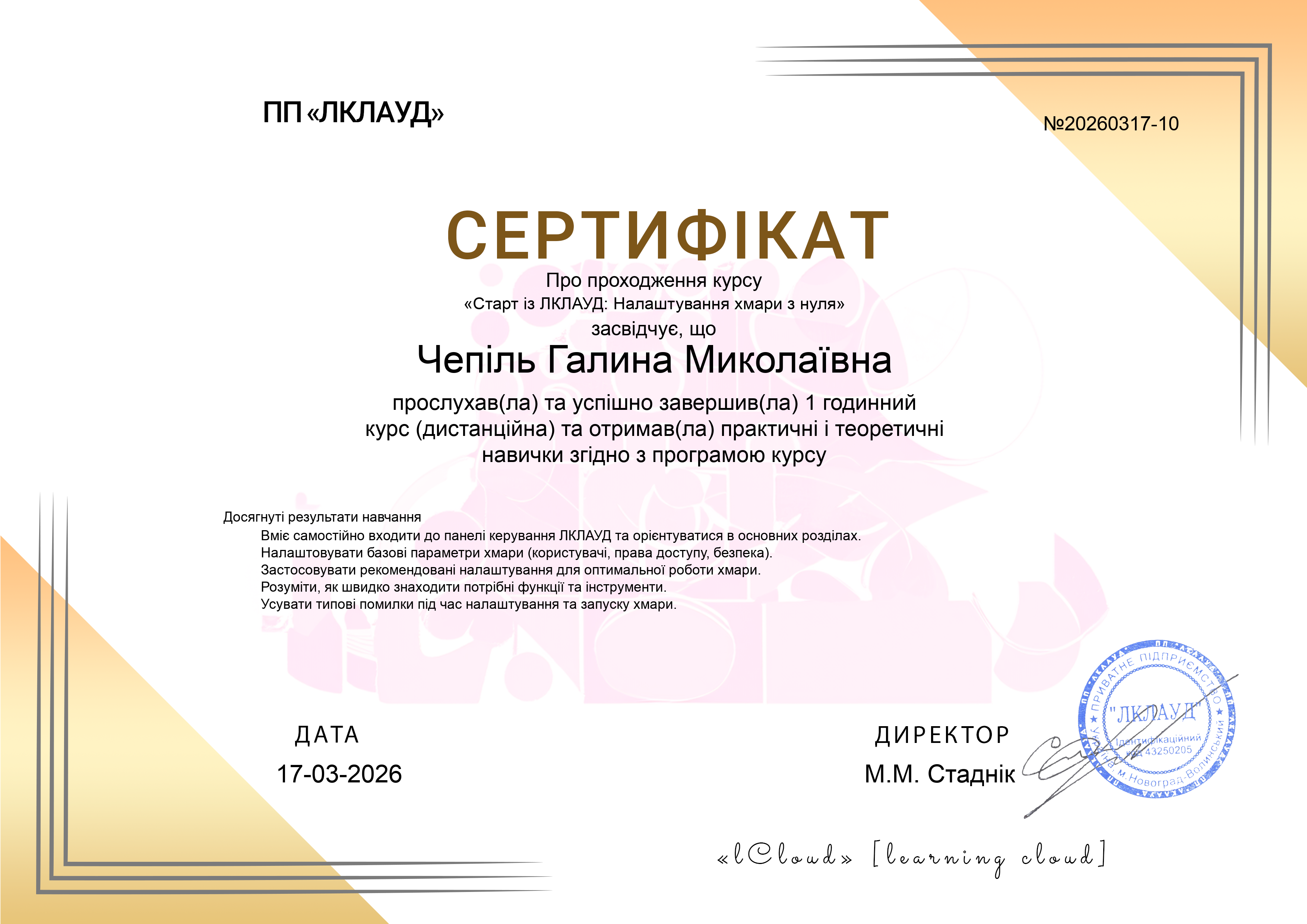Чепіль Галина Миколаївна17.03.2026Сертифікат № 20260317-10