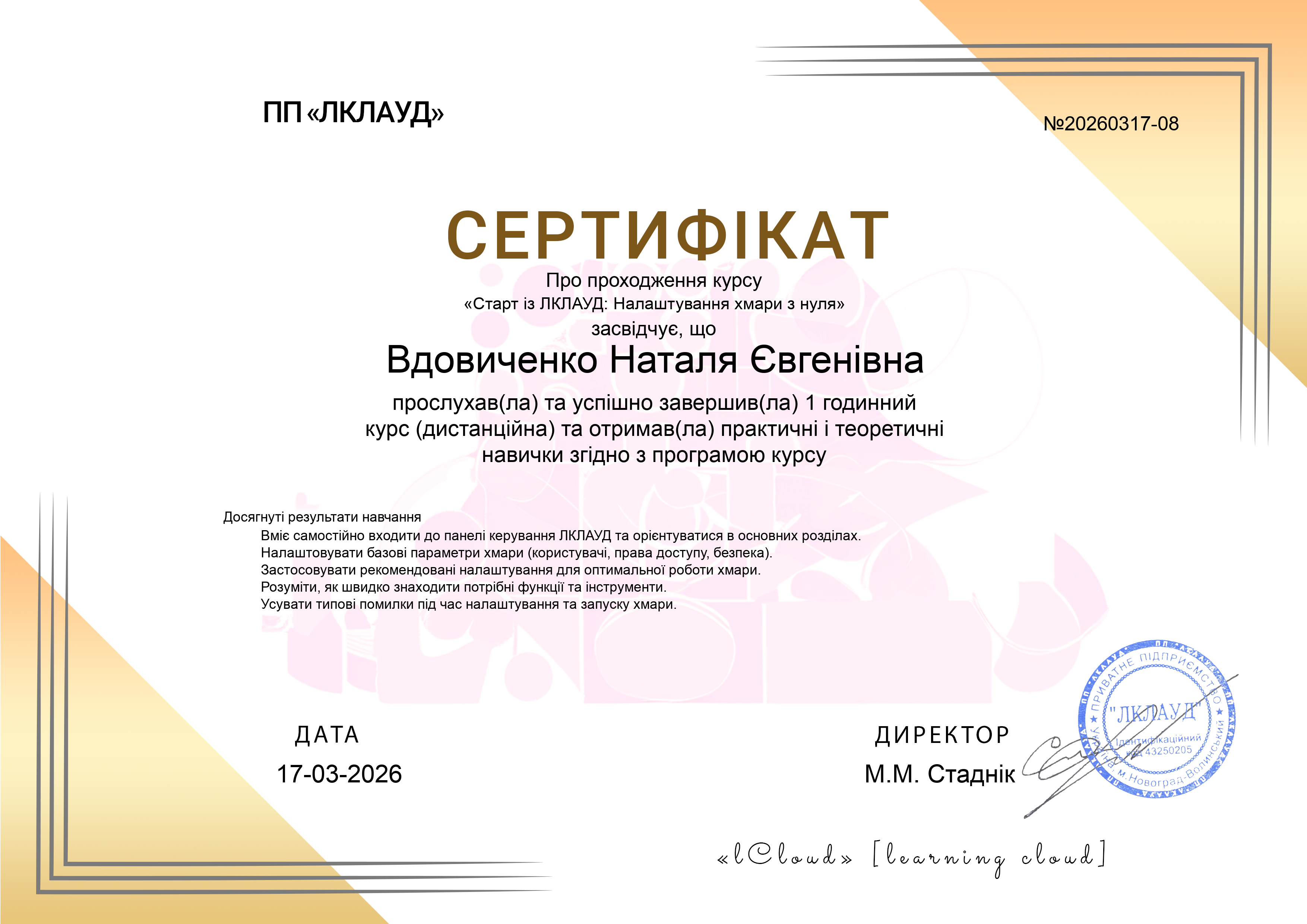 Повернутися до вибору дати Сертифікати учасників курсу «Старт із ЛКЛАУД: Налаштування хмари з нуля» за 17.03.2026